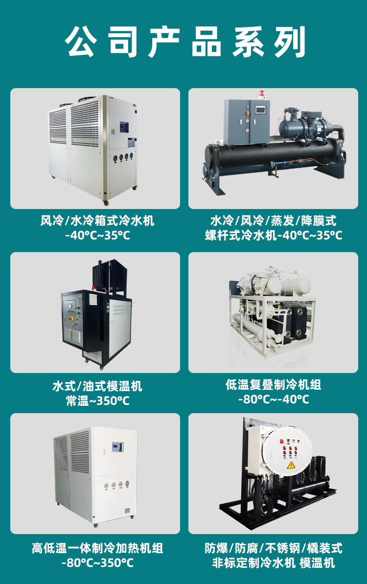 工业冷水机模温机生产厂家,公司主营螺杆式冷水机,风冷式/水冷式冷水机,模温机,高低温一体机等工业制冷加热温控设备。